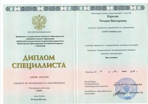 Чуткий и внимательный психиатр-нарколог, это залог успешного выздоровления. Главным преимуществом Татьяны Викторовны как специалиста, является желание помогать людям в любой ситуации. Карпова Татьяна Викторовна окночила Кубанский государственный медицинский университет и Российский университет дружбы народов по специальности - Психиатрия